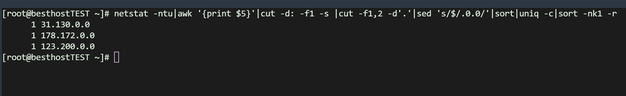 Приведенная выше команда выводит список IP-адресов всех подсетей, которые действительно посылают запросы на подключение к серверу. На этом этапе можно увидеть, откуда поступают соединения и какие IP-адреса связаны с этими соединениями. Из определенной подсети может быть много соединений. Если эта подсеть не должна атаковать сервер с таким уровнем трафика, то, скорее всего, именно она является источником DDoS-атаки.