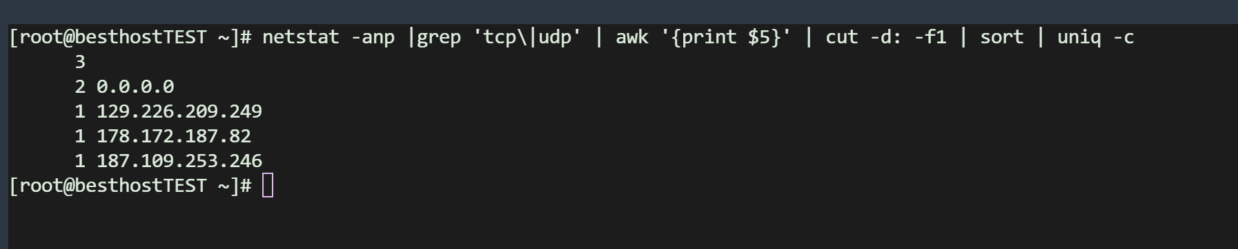 netstat -anp |grep 'tcp\|udp' | awk '{print $5}' | cut -d: -f1 | sort | uniq -c