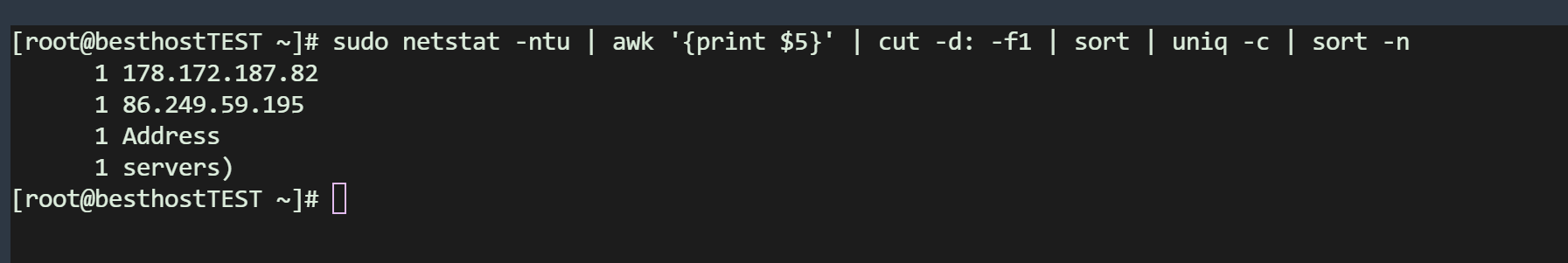 sudo netstat -ntu | awk '{print $5}' | cut -d: -f1 | sort | uniq -c | sort -n